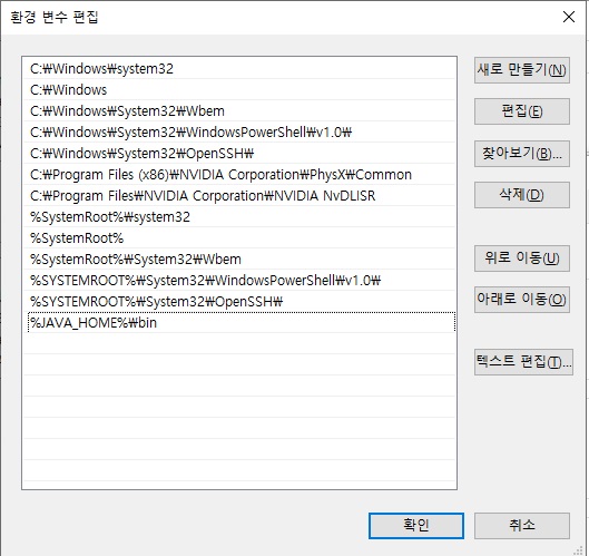 7. '새로 만들기' 선택 후 %JAVA_HOME%\bin 입력후 확인